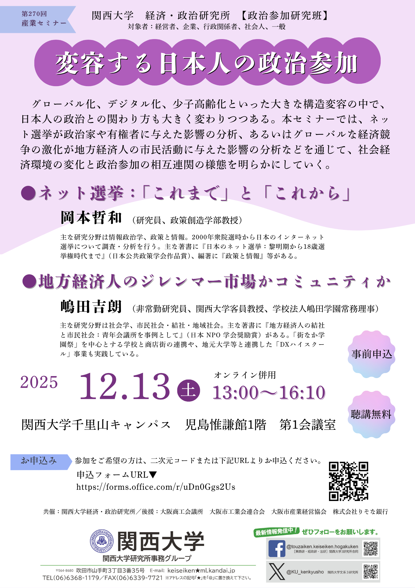 申込フォームを利用されない方は、氏名・連絡先(電話番号またはメールアドレス)・参加人数・参加方法(来場またはオンライン)、件名に「12/13 第270回産業セミナー」と明記の上、下記の問い合わせ先(関西大学 研究所事務グループ)までご連絡ください。
