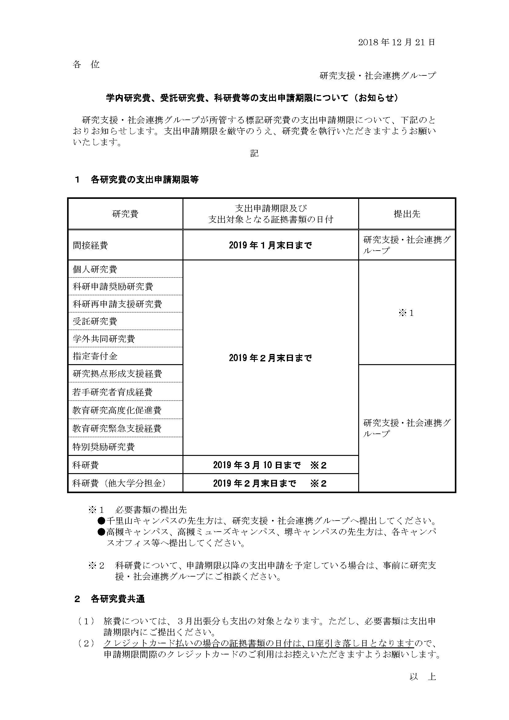 【年度末】各研究費の支出申請期限について お知らせ 2019年01月17日 【年度末】各研究費の支出申請期限について 支出申請期限が迫っています。 お早目に執行いただきますよう、お願いいたします。 学内研究費及び科研費の支出申請期限について(PDF) 最新情報一覧