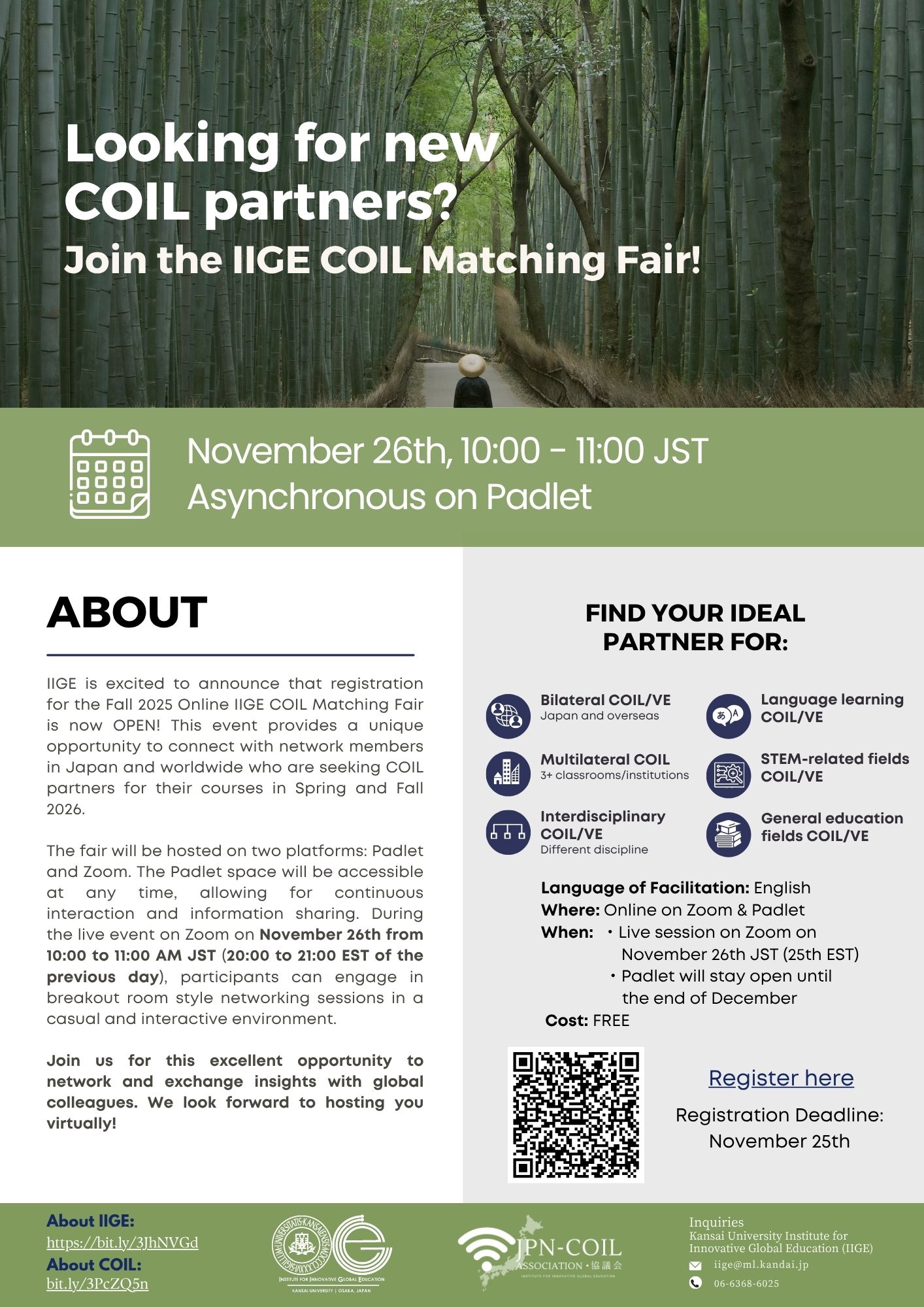 This event provides a unique opportunity to connect with network members in Japan and worldwide who are seeking COIL partners for their courses in Spring/Fall 2025.