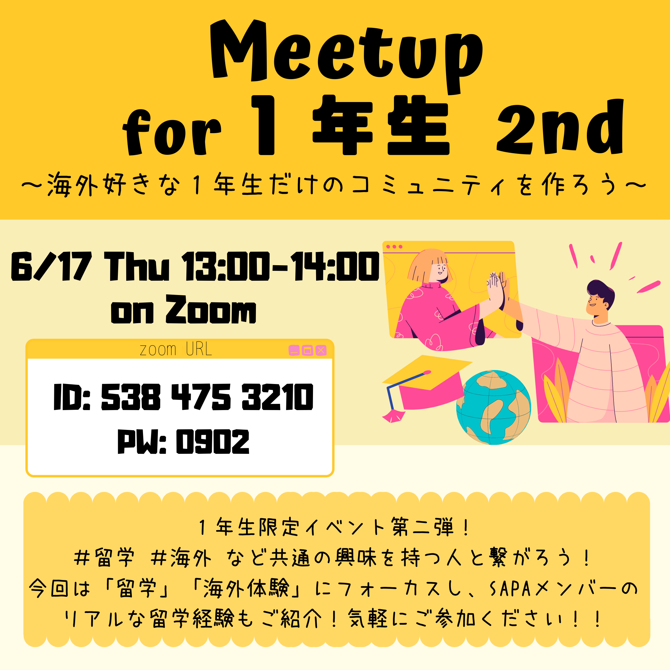 内容:1年生MEETUP企画第二弾。1年生のみを対象とし、留学や海外に興味がある1年生同士の輪が作れるようなレクリエーションとSAPAメンバーの留学経験をご紹介します!