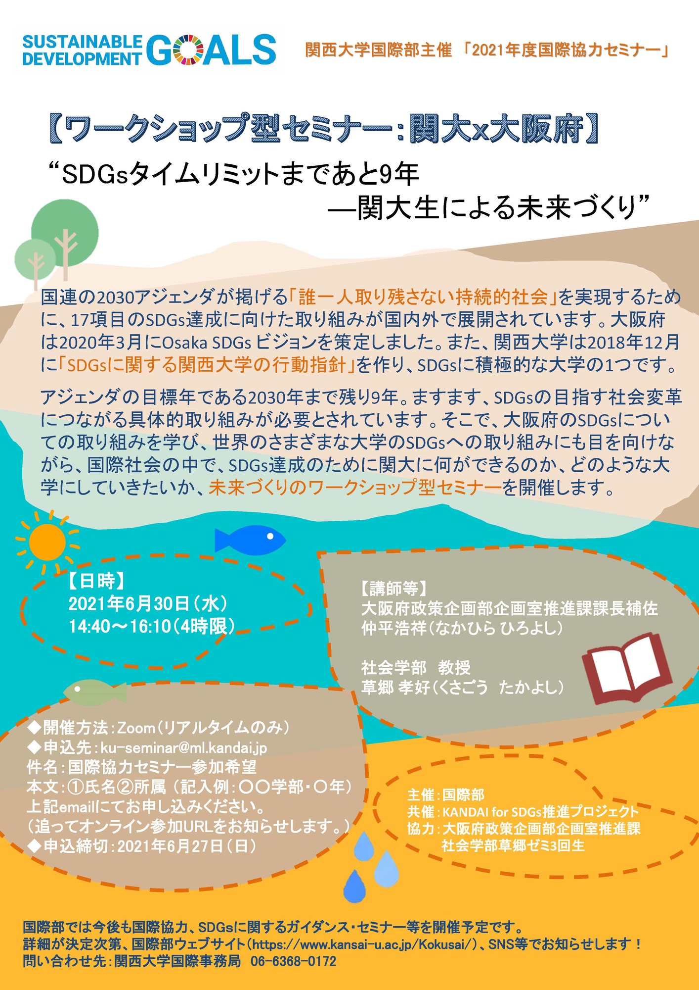 6月30日(水) 14:40~16:10(4限)に、2021年度2021年度国際協力セミナー【ワークショップ型セミナー:関大x大阪府】“SDGsタイムリミットまであと9年―関大生による未来づくり”を開催します。