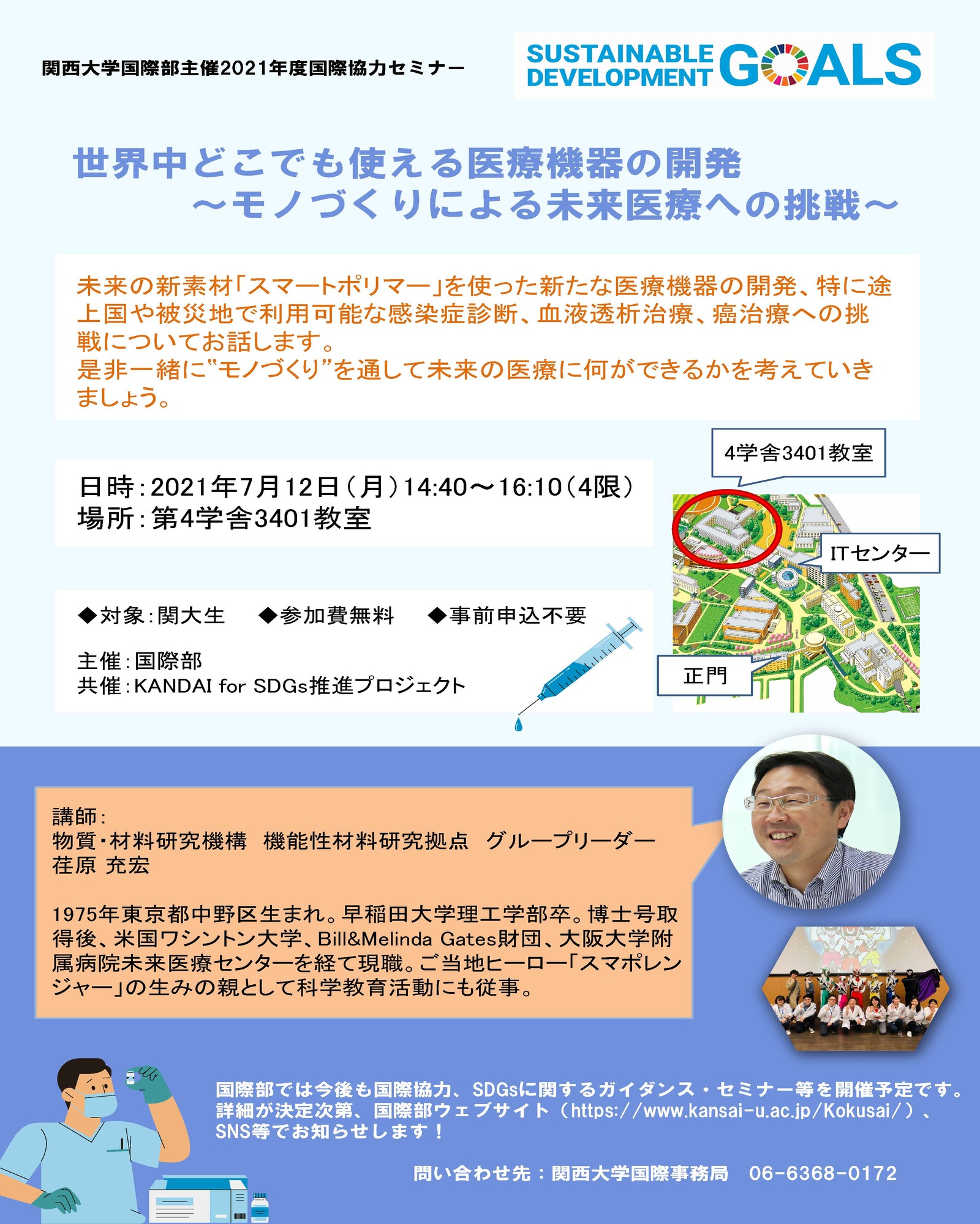 7月12日(月) 14:40~16:10(4限)に、2021年度国際協力セミナー “世界中どこでも使える医療機器の開発~モノづくりによる未来医療への挑戦~”を開催します。