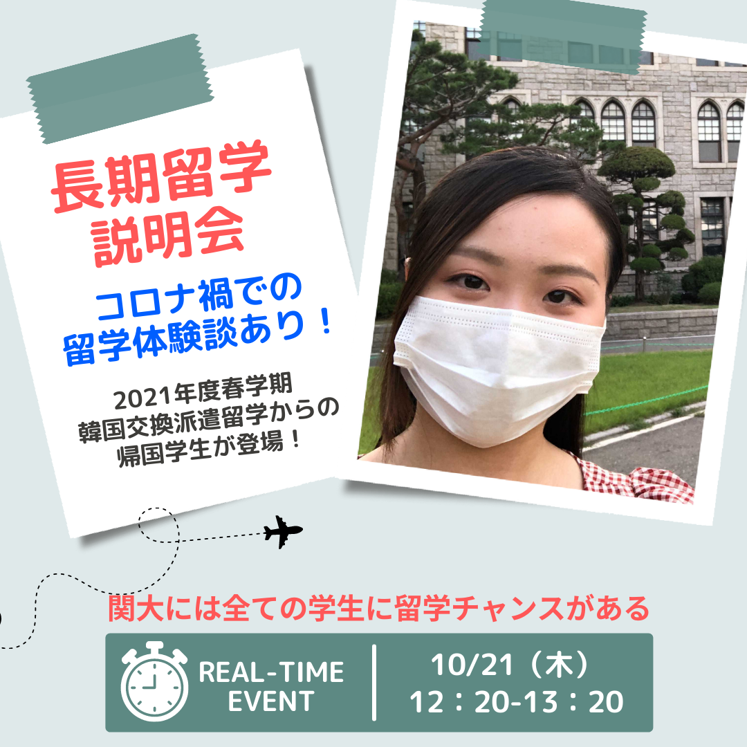各種長期プログラムの概要、最新の募集状況に加え2021年春学期、韓国に交換派遣留学した関大生の体験談を語ります。