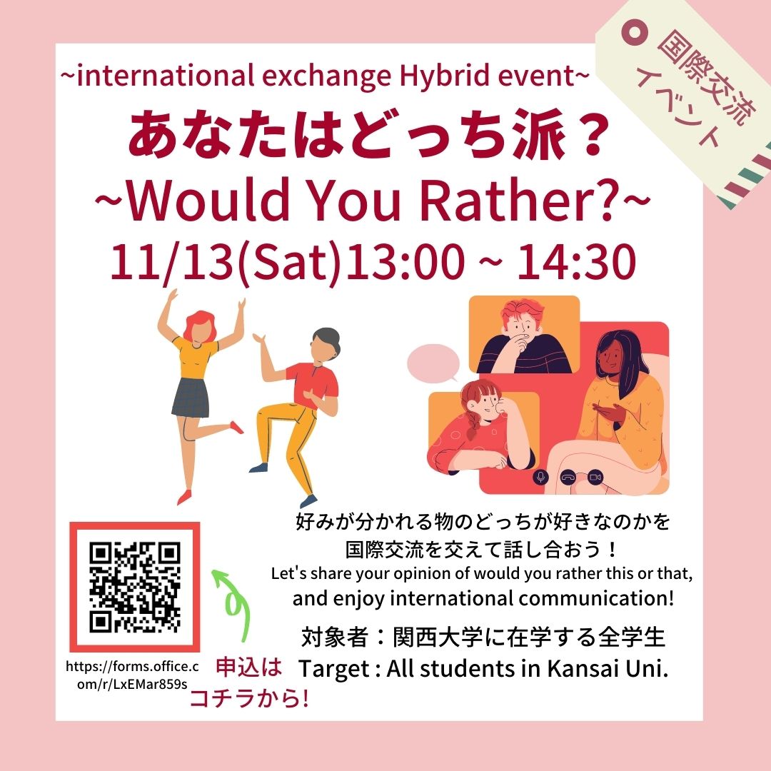 We will be holding international activity 『Would you rather?/あなたはどっち派?』 for All Kansai university students! This international exchange event will be planned as hybrid event which is held online and face-to-face.
