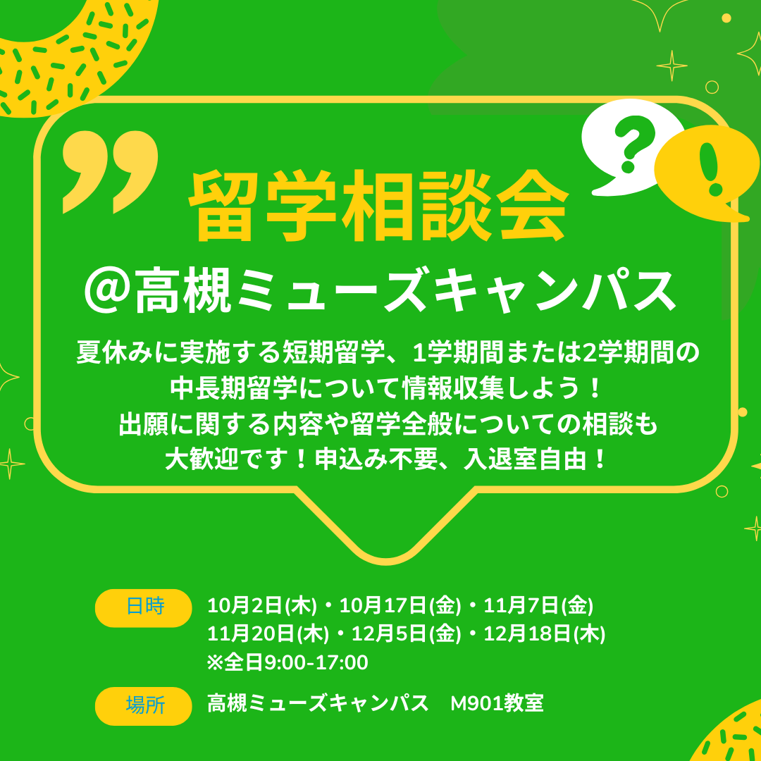 関大の留学制度や各留学プログラムに関する詳しい情報、学内でできる国際交流に関する情報収集など、気軽に相談できるイベントを開催します。