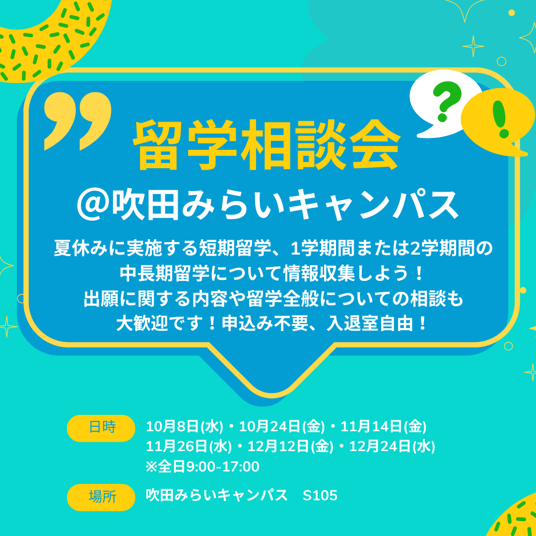 関大の留学制度や各留学プログラムに関する詳しい情報、学内でできる国際交流に関する情報収集など、気軽に相談できるイベントを開催します。
