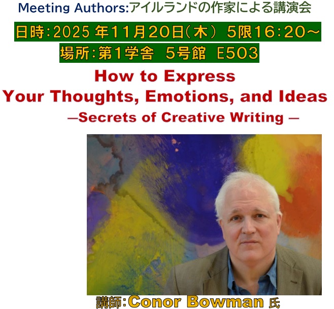 アイルランドの作家コナー・ボウマンさんが、関西大学の学生のために、クリエイティヴ・ライティングとご著書に関する講演会を行います。