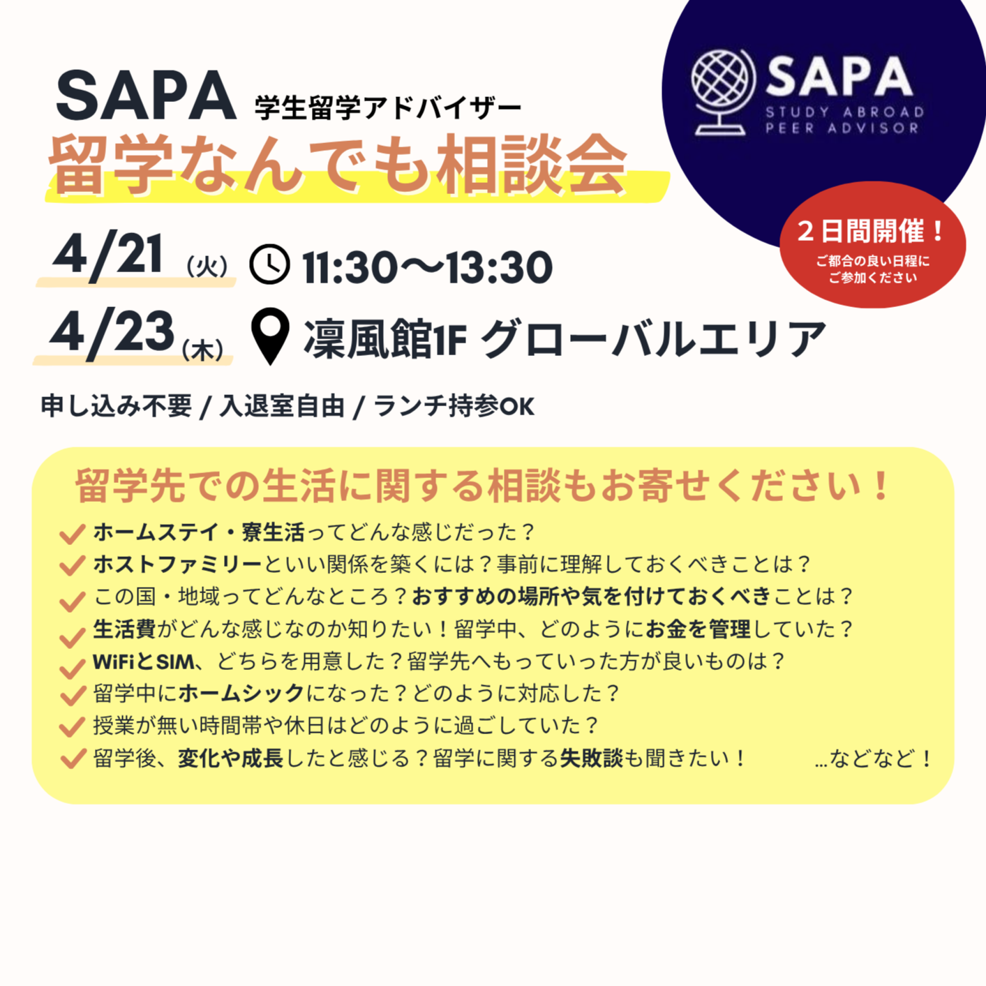 SAPAは自身の留学経験を基に、留学を検討している関大生のサポートをしています。