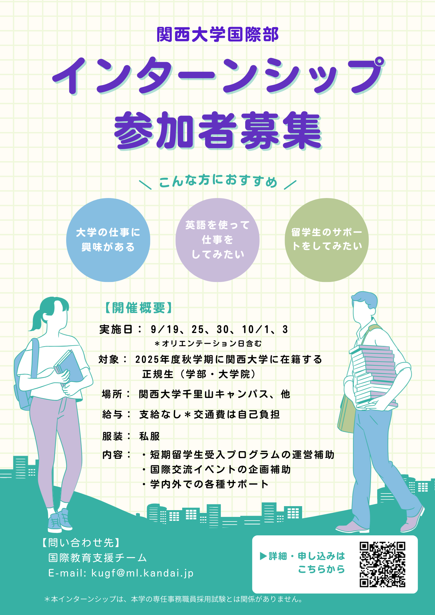 これに伴い、国際部では、プログラムの運営補助やイベント企画を行う、インターンシップ生を下記のとおり募集します。