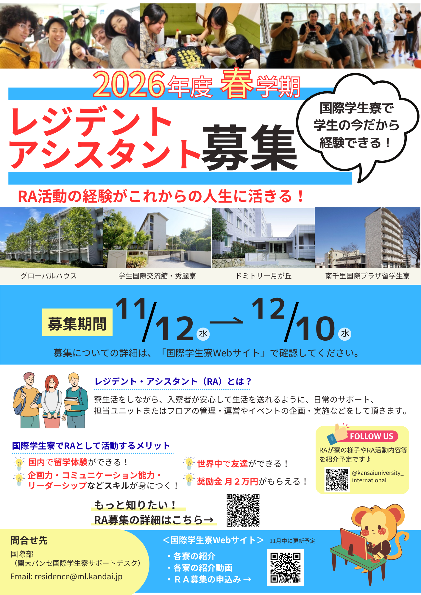 ◆国際学生寮で活躍!グローバルな力を身につける!◆2026年度春学期 レジデント・アシスタント(RA)大募集!Recruiting Resident Assistants for Spring 2026