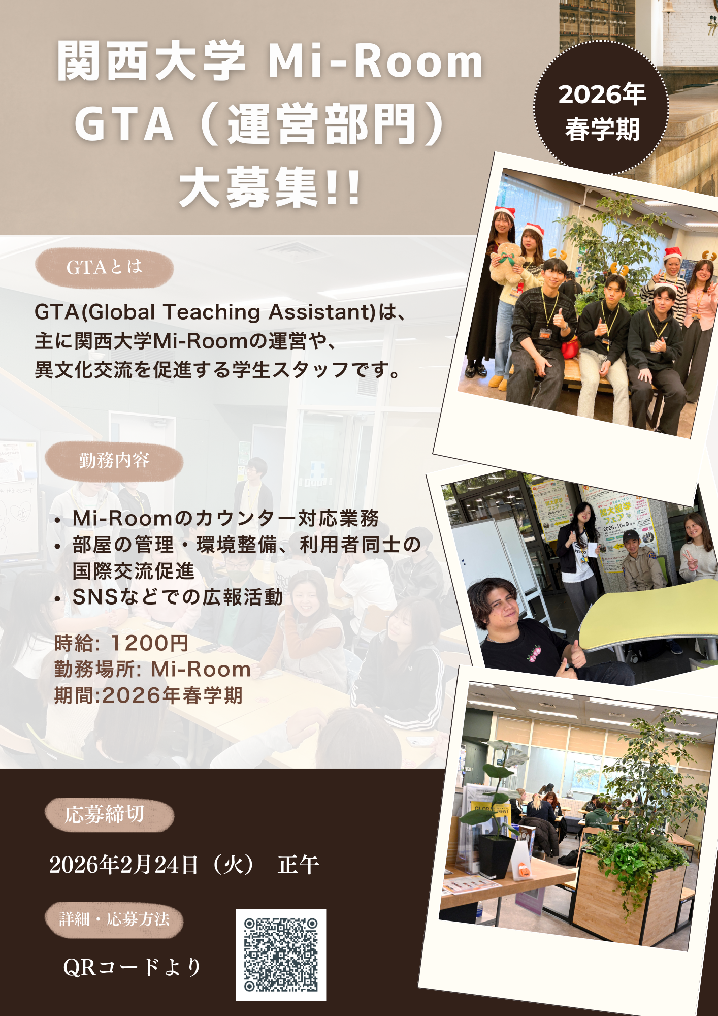 Mi-Roomのカウンター対応業務、部屋の管理・環境整備、利用者同士の国際交流促進、国際交流イベントの企画・運営、SNSなどでの広報活動、その他国際部の職員がお願いする業務