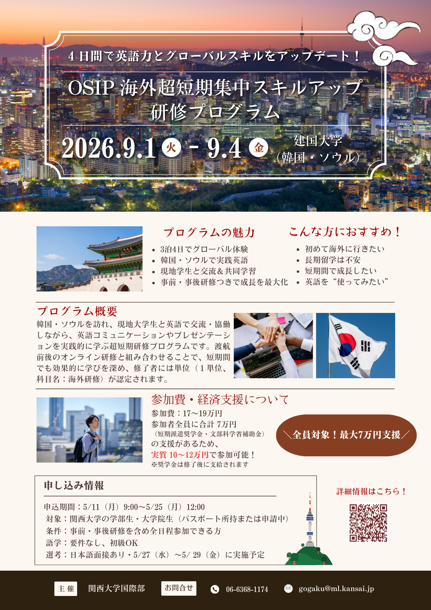 本プログラムでは英語をただ“勉強する”のではなく、“実際に使う”ことを重視しています。韓国の大学という海外環境の中で、現地学生との交流やグループワークを通じて、自分の英語がどこまで通じるのかを試すことができます。教室の中だけでは得られない、リアルなコミュニケーション力を身につけることができます。