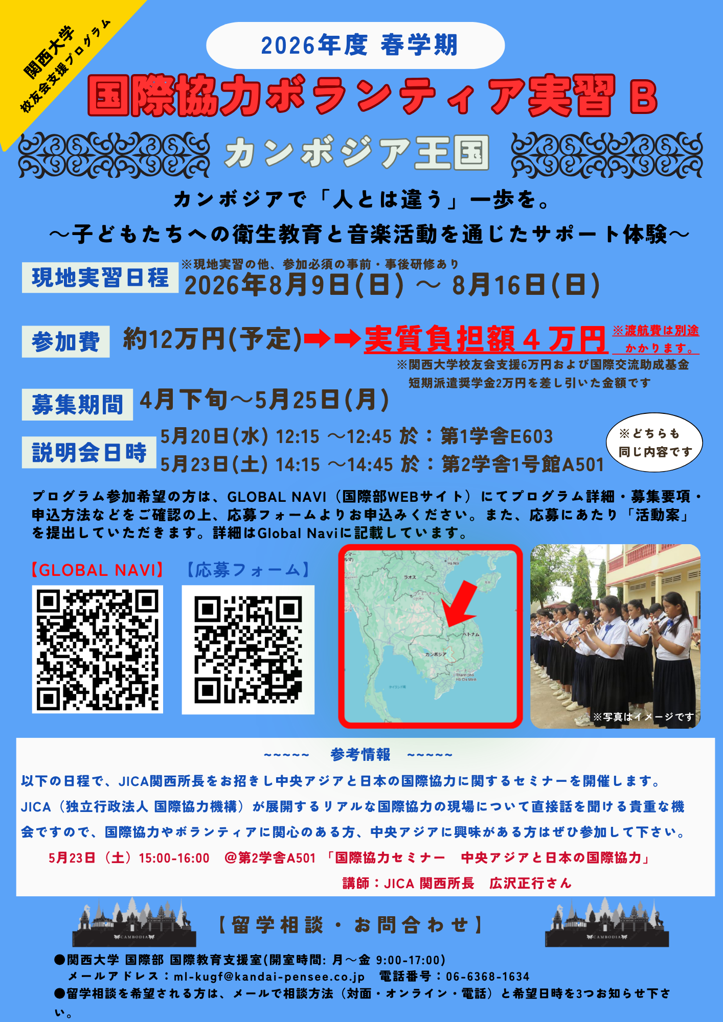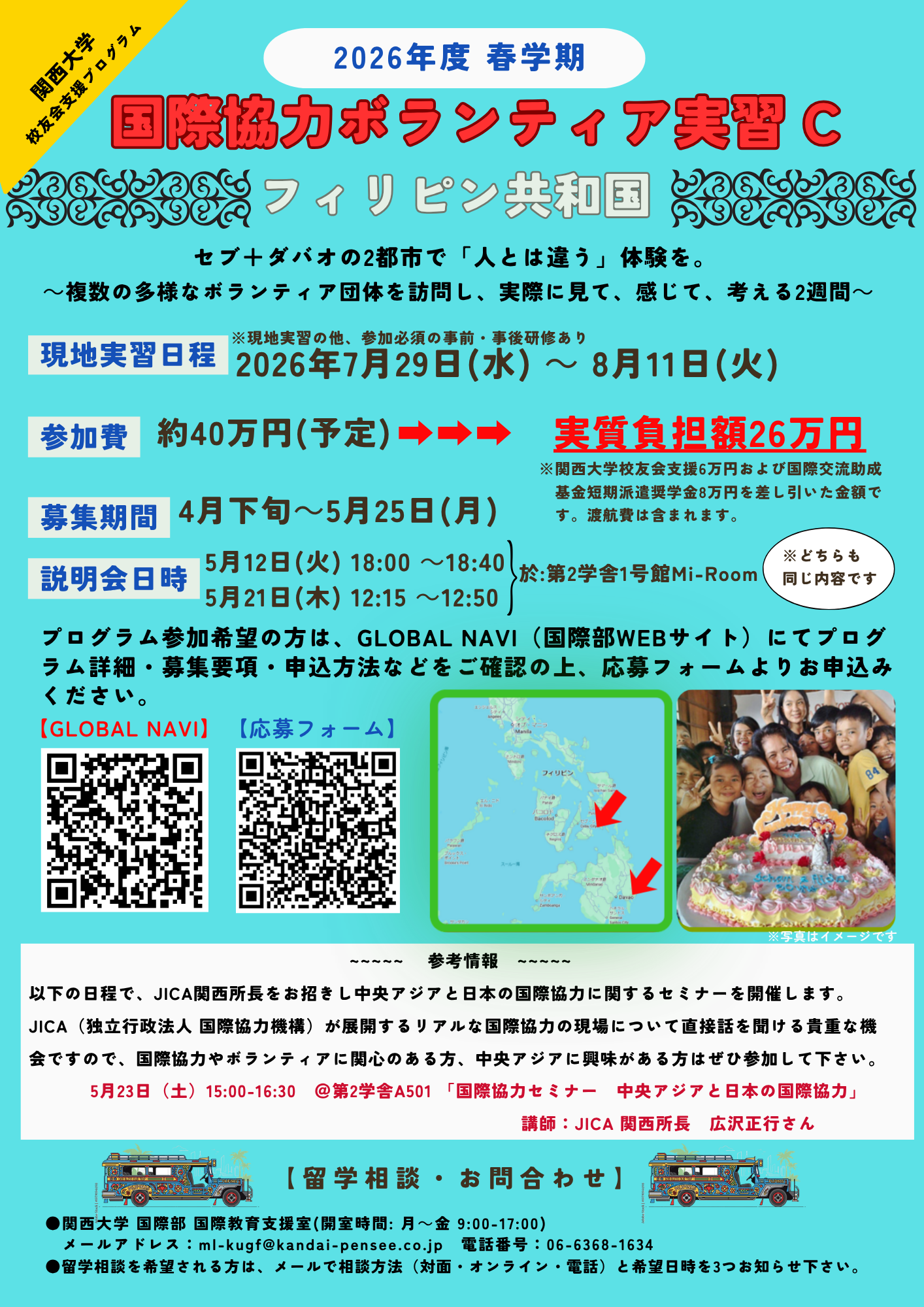 2026年度 春学期 「国際協力ボランティア実習((B:カンボジア、C:フィリピン)」の募集が始まりました。夏休みに「人とは違う」留学をしてみたいという方にピッタリです。国際協力やボランティアに関心のある方はもちろんのこと、就活を終えた方、学生生活の締めくくりなどに、視座を広げる絶好のチャンスです。興味のある方は、是非ご参加ください!