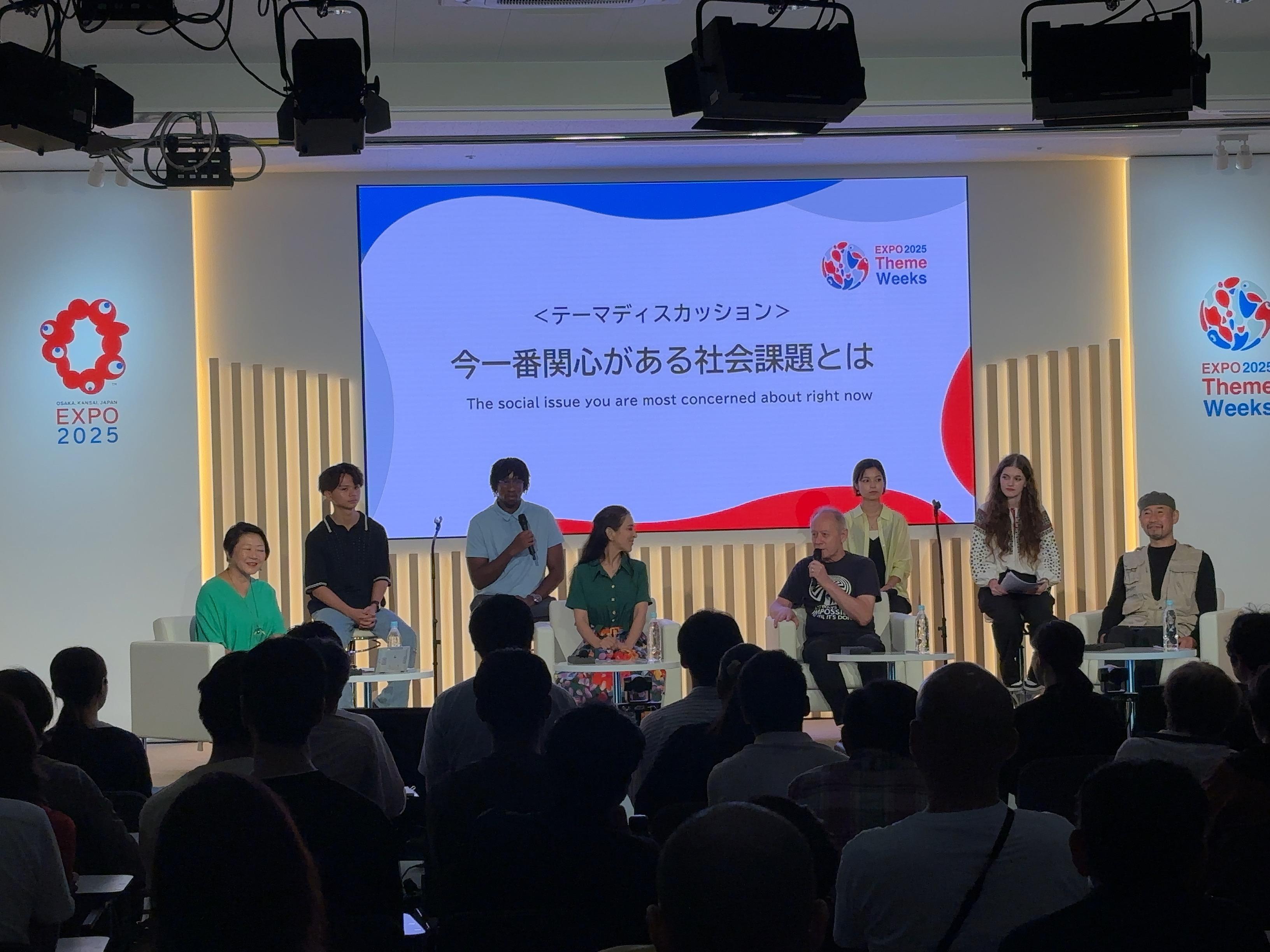 2025年8月05日、大阪・関西万博にて平和と人権について考えるトークイベントが開催されました。国際連合広報センターの根本かおるさんがモデレーターとなり、俳優のサヘル・ローズさん、ブロードキャスターのピーター・バラカンさん、戦場カメラマンの渡部陽一さんと一緒に本学の学生4人が対談し、さまざまな社会課題とその解決に向けた取り組みについて話し合いました。