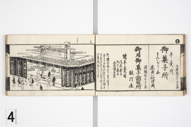 浪華書林松岡栄作らによって、慶応3(1867)に補刻された大阪市中の店を紹介した書物。約280種の業種をいろは順に分類し、店の名前や所在地、商品の種類などのほか、なかには店頭の様子が描かれているものもあります。