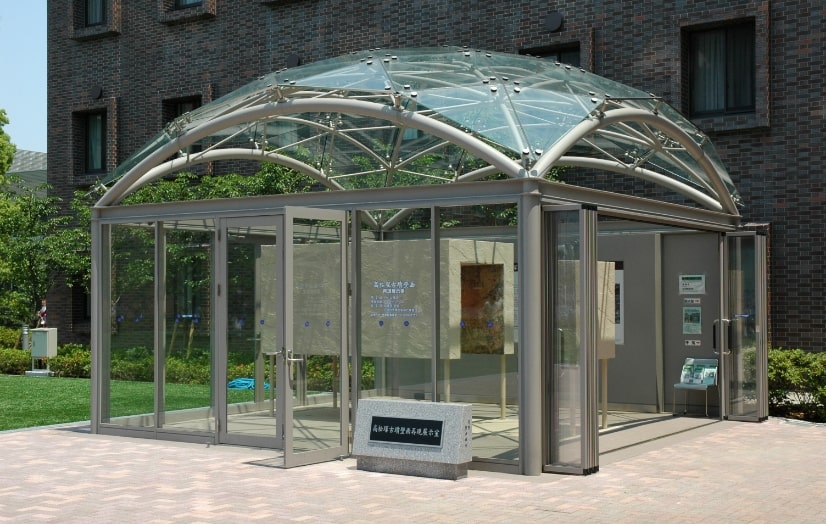 関西大学博物館(簡文館)前の高松塚古墳壁画再現展示室では、墳丘をドーム状の透明ガラスで表現し、その中に精緻な美術陶板で再現した壁画を設置しています。