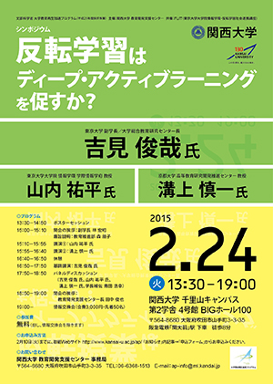 2月24日、関西大学千里山キャンパスにおいて、反転学習シンポジウム(第10回日常的FD懇話会の枠組)を開催した。今回のシンポジウムでは基調講演者に吉見俊哉先生(東京大学副学長)、講演者に山内祐平先生(東京大学)、溝上慎一先生(京都大学)という反転学習に造詣が深い3名を迎え、「反転学習はディープ・アクティブラーニングを促すか」と題し、ご講演、ポスターセッション、パネルディスカッションを展開した。以下、当日のプログラムである。