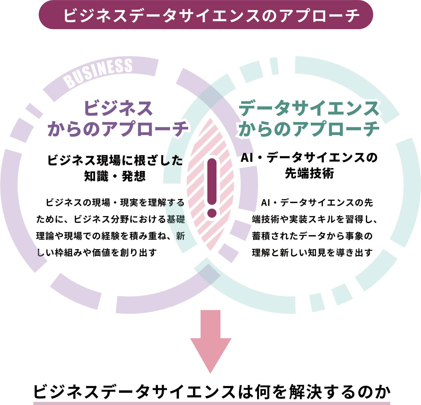 情報科学の進歩は驚くばかりです。たとえば、膨大な人の行動データが集められ、解析されることで「未来予測」の精度が大幅に向上しました。また、AIの進化は社会を大きく変える予感を漂わせています。しかし、データもAIも、そのままでは単なる情報に過ぎません。それらをどう活用して私たちの世界を豊かにするのか、そこには人々のニーズをとらえるビジネスの視点が不可欠です。情報を使いこなし、ビジネスの発想で社会の問題を解決する、いま最も注目される学問の一つが「ビジネスデータサイエンス」です。そして、その最先端を追究できるのが、ビジネスデータサイエンス学部なのです。