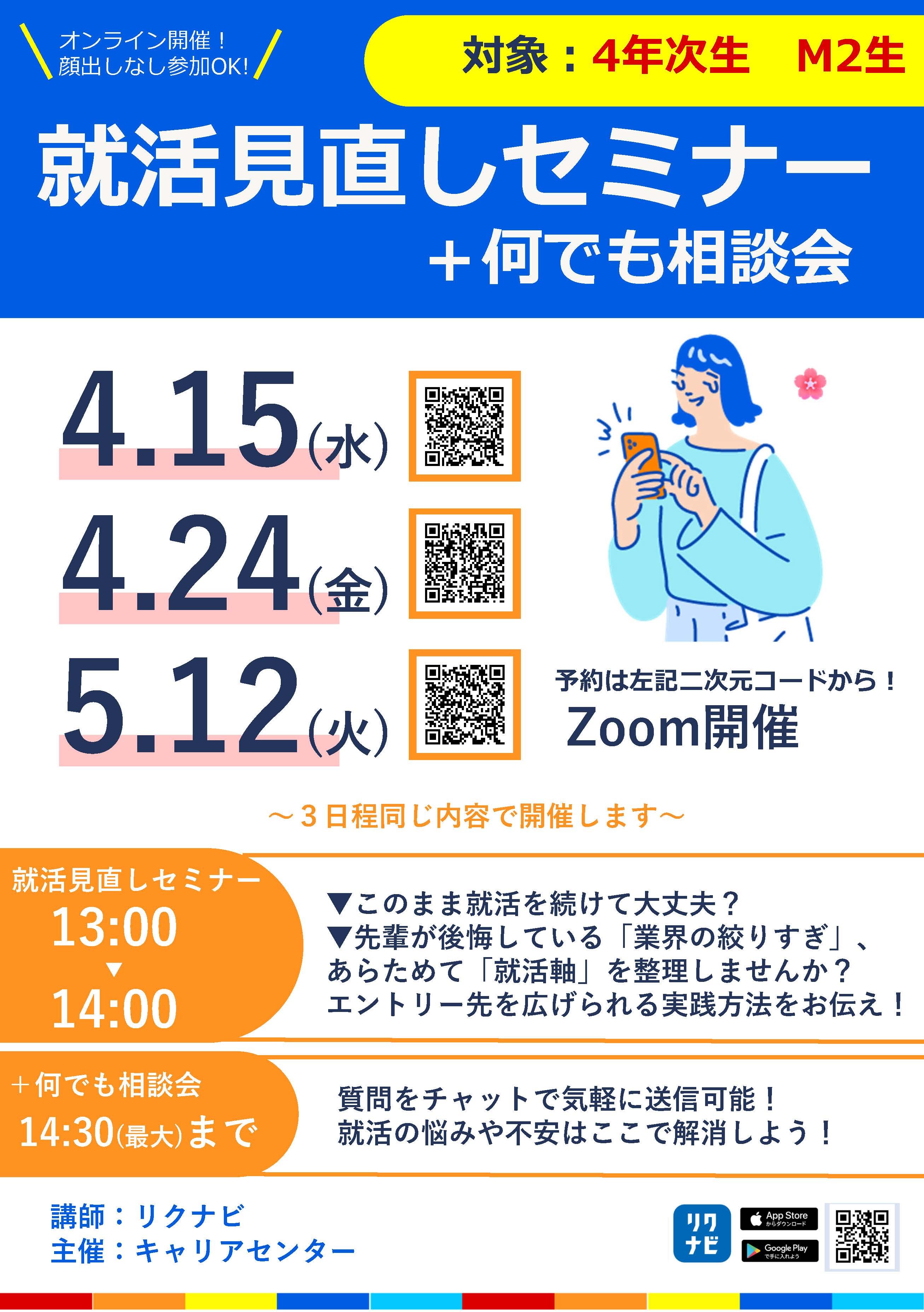 キャリアセンターでは、「就活見直しセミナー+何でも相談会」を開催します。
