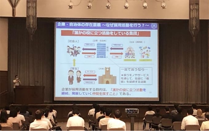 さらに本格化する就職活動の事前準備として「今、何をすべきか」具体的な対策とその方法について説明を行います。併せて秋学期実施のキャリアセンター主催行事の案内を行います。