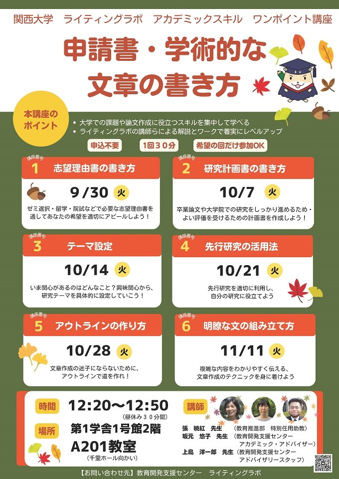 2025年秋学期 アカデミックスキルワンポイント講座「申請書・学術的な文章の書き方」開講のお知らせ