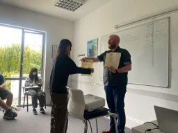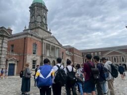 この日は、最後の授業日でした。授業では、それぞれが調べたアイルランドの有名な人物や観光名所についてグループで発表を行いました。緊張しながらも、2週間の学びの成果をしっかりと英語で伝える姿が印象的でした。発表の後には、先生から一人ひとりに修了証が手渡されました。午後、ホームステイ組はダブリン市内を訪れ、クライストチャーチ大聖堂やダブリン城を散策しました。クライストチャーチ大聖堂は11世紀に建てられたダブリン最古の教会です。夜のアクティビティでは、アイルランドをテーマに、ミニキャンバスに絵を描く創作活動を行いました。一方、学生寮に滞在しているグループは、前日と同様に2グループに分かれて、スポーツ活動とSTEAMのプログラムに取り組みました。