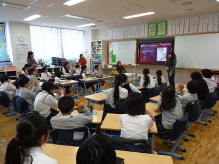 2012/12/17 関西大学留学生と交流をしました 12月14日(金)、4・5年生が関西大学留学生と交流をしました。子どもたちは、留学生の方々や出身国(台湾・タイ)について興味津々。たくさん質問をしていました。