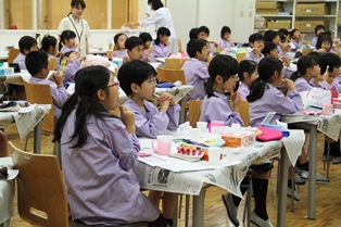 2014/07/02 歯みがき指導(2年生)を行いました。 学校歯科医、歯科衛生士の先生を講師として招き、歯の大切さの講演と歯みがきの実技指導を行っていただきました。 ていねいに一本一本みがく方法を学びました。