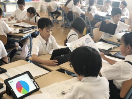 共同編集なので、リアルタイムにグラフが変化します。それを見た子どもたちからは、最初は「コンビニ頑張れ!」「スーパー増えてきた!」といったグラフの変化に対する発言が多かったのですが、次第に「あれ?なぜコンビニは少ないのかな?」というような疑問も出てきました。