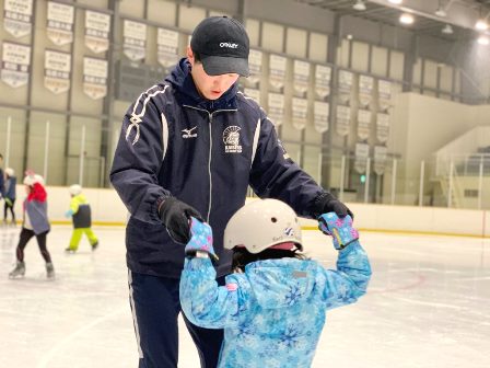 関西大学アイススケート部の大学生が、氷の上での立ち方や歩き方、滑り方などをひとつひとつ丁寧に教えてくれました。