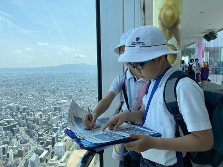 2024/06/11 4年生が校外学習を実施しました 6月11日(火)、4年生が校外学習で「防災×環状線一周の旅」に出かけました。 電車の中では車窓から大阪の街並みを観察し、中にはメモを取る子もいました。 大阪駅から環状線に乗って天王寺まで行き、あべのハルカスとあべのタスカルへ行きました。あべのハルカスでは大阪の街並みを一望して街の特色を捉え、あべのタスカルでは震度7体験や消火訓練、火災(煙)体験などを行いました。 この学びを、以降の学習にどう繋げるか、これからの子どもたちの姿を楽しみにしています。