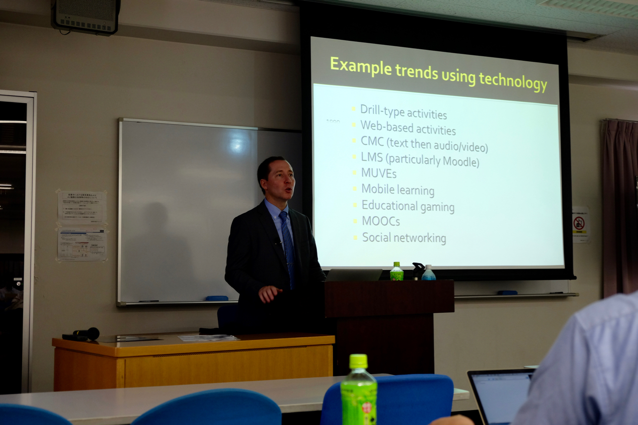 "Technology and the changing face of language teaching"をテーマに講演が行われ、教員や学生合わせて約20名が参加していました。Stockwell先生には,言語教育においていかに効果的にテクノロジーを使用するかという重要なテーマを,非常にわかりやすく理論的にバランスの取れた観点からご講演していただきました。また,質疑応答では参加者の意見交換も活発に行われました。