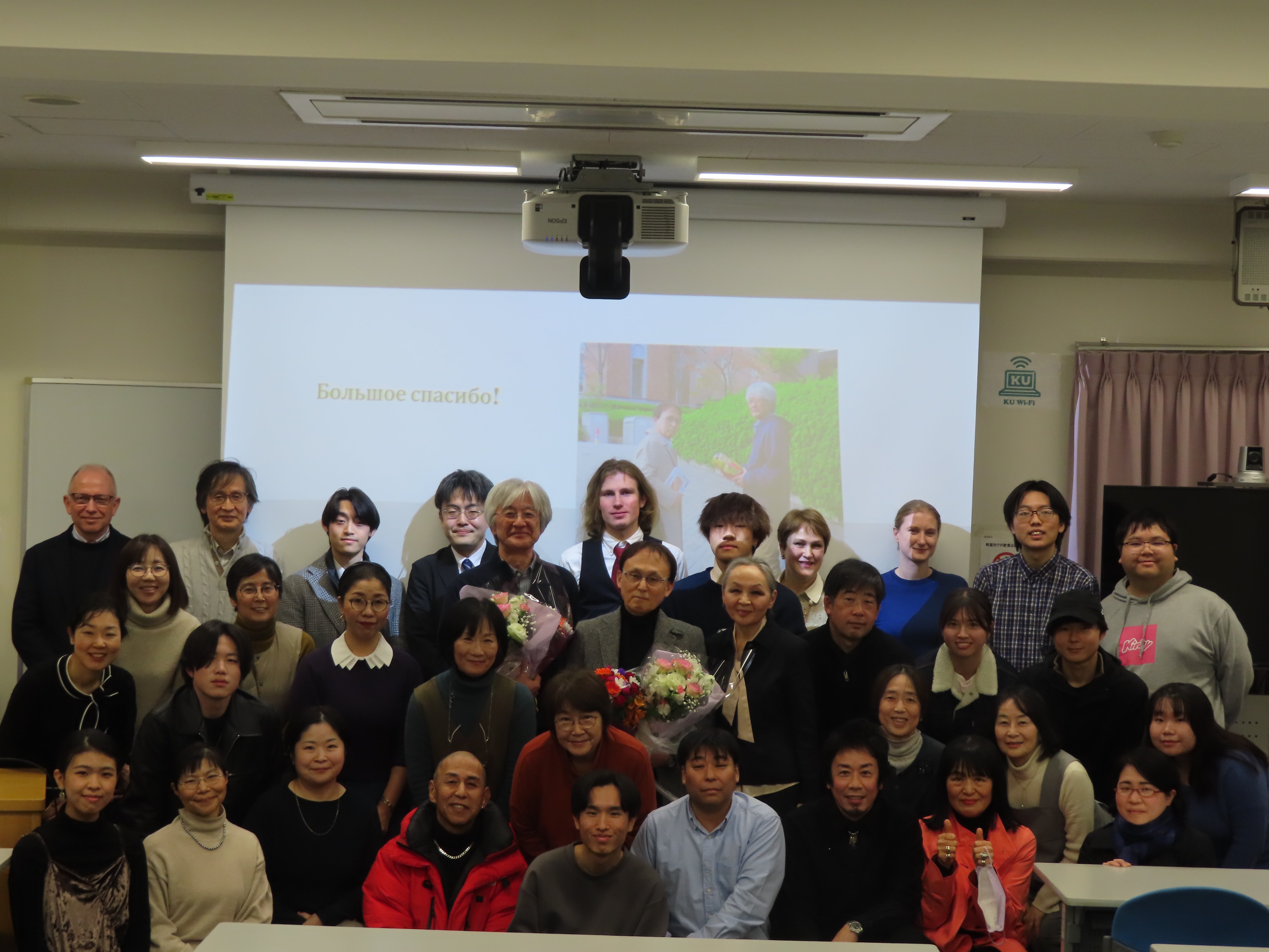 講演の中では、長年にわたり関西大学でロシア語教育に携わってこられたお二人の思い出やエピソードも語られました。「記念品贈呈」では、関西大学ロシア語教員一同からの花束と記念品に加えて、『ピロシキ・ワークショップ永久参加証』が外国語学部・小田桐 奈美准教授から渡されました。