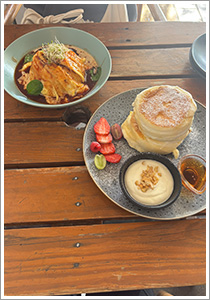 春学期の授業は9時から、夏学期は10時20分から始まり、15時半ごろに授業が終わります。寮から教室まではバスを使えば10分、徒歩で20分なので通学しやすいです。授業が終わるとそのまま寮に帰ることもありますが、日本語を学んでいる現地の学生と交流できるJapanese Language Tableに参加したり、ダウンタウンに行ったり、夏には湖に行ったりすることもあります。ダウンタウンまではキャンパスから無料のバスが出ていて、10分ほどで着きます。ダウンタウンには多くのレストランやカフェ、雑貨屋や服屋があり、歩いているだけでも楽しめます。湖は近くにバス停がないため、現地の学生と友達になって連れて行ってもらっていました。夕食は寮の近くに食堂があるため、そこでよく食べています。夕食後は課題をしたり、趣味に時間を使ったりとのんびりと楽しい1日を過ごしています。