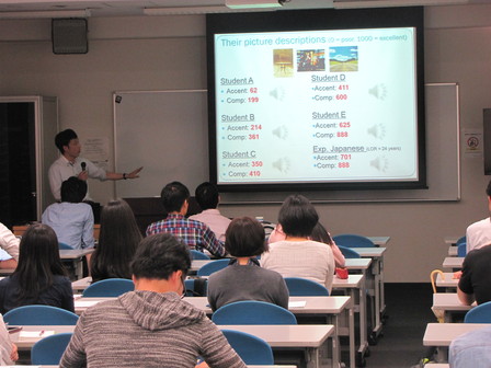 Kazuya Saito先生(Lecturer, Birkbeck, University of London)をお招きして、「Roles of Individual Differences in Second Language Speech Learning in Japanese EFL Classroom Settings」のタイトルの下、スピーキングにおける個人差の影響についてお話いただきました。参加者の活発な意見交換は、講演中はもちろん、終了後も長く続き、充実した講演会となりました。