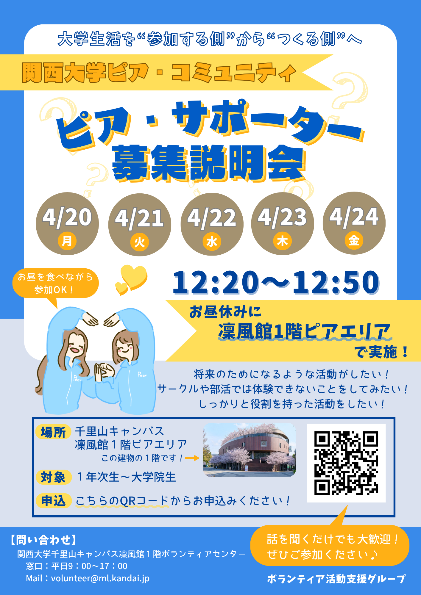 新入生をはじめ、「充実した大学生活を送りたい」「新しいことに挑戦したい」と考えている皆さんに向けて、ピア・サポーター募集説明会を開催します。