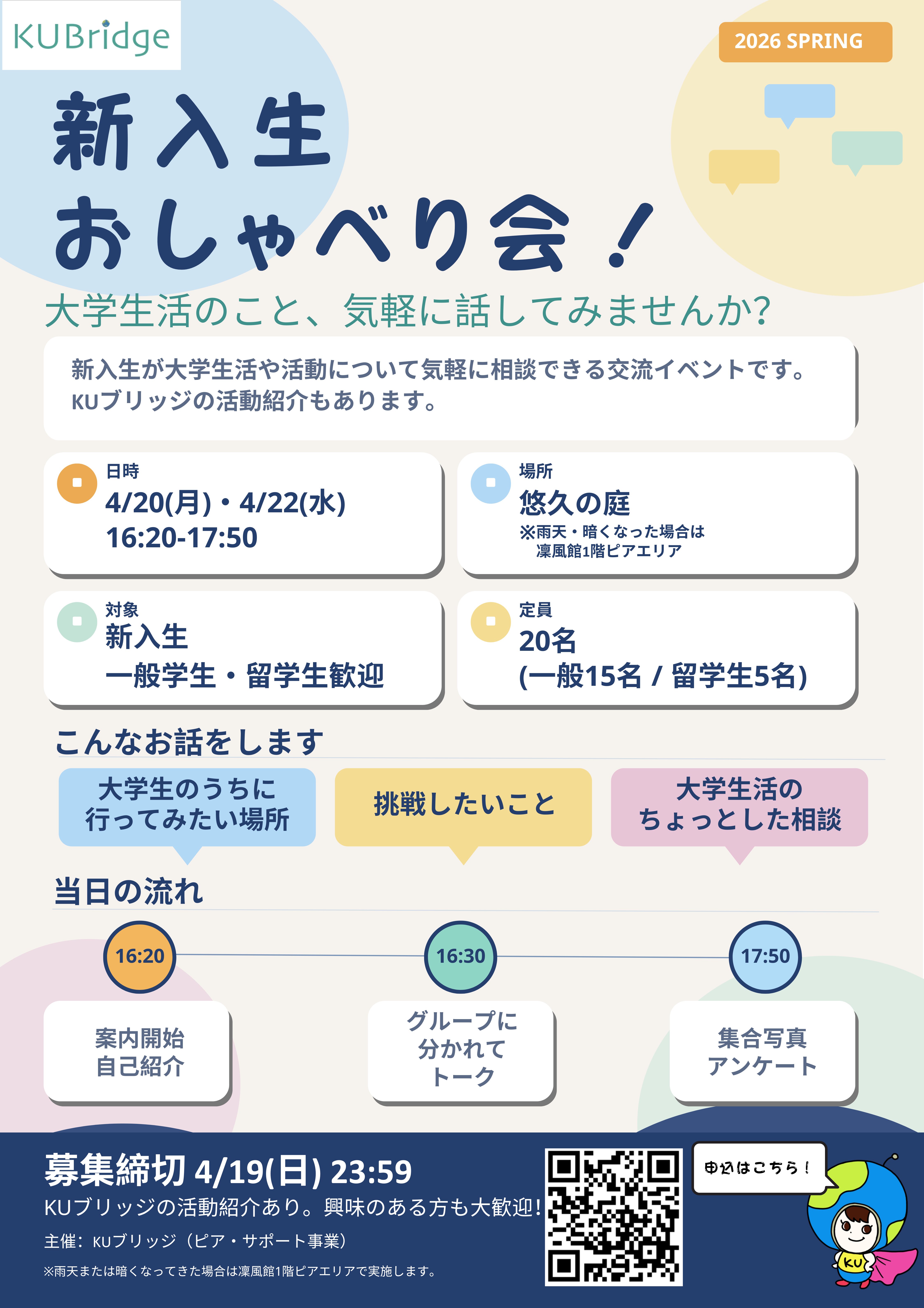 本イベントでは、KUブリッジの活動の説明をメンバーが行う時間も設けていますので、少しでも興味のある方は、ぜひお越しください!