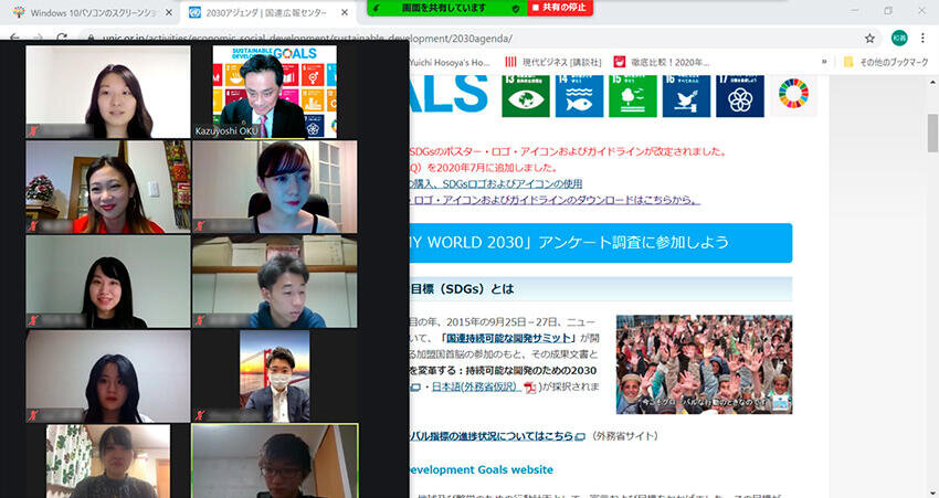 奥先生がコーディネートする授業『SDGs入門・実践』は春学期の「入門編」と秋学期の「実践編」で構成されている学部横断型科目。取材を行った9月初旬は、オンラインで開講された前期授業が終わり、後期に向けて準備を進められているタイミングでした。