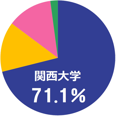 3校共通の制度で、関西大学独自のテストである「関西大学併設高等学校共通テスト」の成績、実用英語技能検定のスコアのほか、高校3年間の成績や主体性等を総合的に評価します。学校の特色により、関西大学に内部進学する割合に違いはありますが、合格率は各校ともほぼ変わらない値となっています。