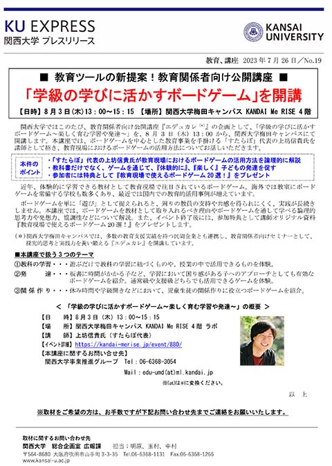 プレスリリース「『学級の学びに活かすボードゲーム』を開講」を配信