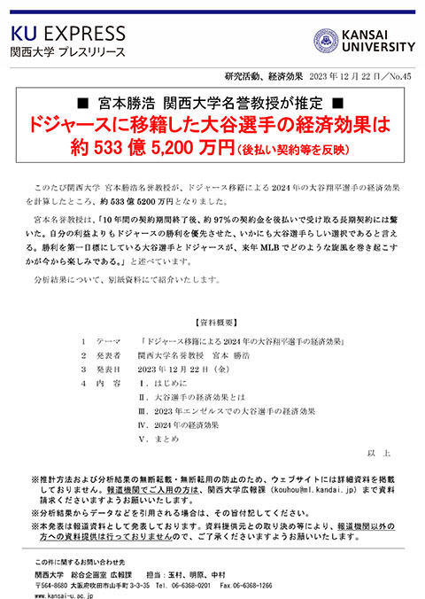 プレスリリース「宮本勝浩名誉教授が試算。ドジャース移籍による2024年の大谷翔平選手の経済効果」を配信