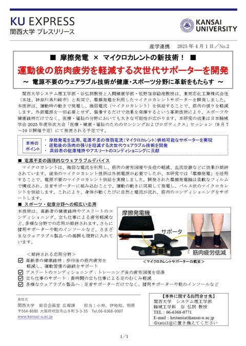 関西大学システム理工学部・谷弘詞教授と人間健康学部・佐野加奈絵准教授は、東京応化工業株式会社(本社、神奈川県川崎市)と共同で、摩擦発電を利用したマイクロカレントサポーターを開発しました。本技術は、運動時の動きで発電し、微弱電流(マイクロカレント)を供給することで、筋肉の張りを軽減します。外部電源を一切必要とせず、装着するだけで効果を発揮するという革新技術により、スポーツや健康維持だけでなく、医療・福祉の分野においても大きな可能性が広がります。本研究の成果は日本機械学会2025年度年次大会「医療・健康・福祉のためのセンシングおよびロボティクス」セッション(9月7~10日開催予定)にて発表される予定です。