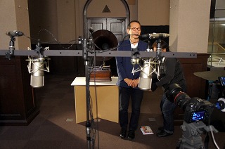当日は電気録音対応蓄音機(英国グラモフォン社1928年製HMV193)と同じ年代の建物である関西大学博物館で、大阪芸術大学博物館事務長・学芸員の柳知明氏をナビゲーターに、シリンダ型、アコースティック対応、電気録音対応蓄音機のそれぞれの特徴の解説と再生を行い、映像とハイレゾ立体音響の収録を行いました。最終的には、ソシオ音響スタジオ対応ソフト(ハイレゾ立体音響)と、DVD(ステレオ)の2種類の教材ソフト(30分程度)を制作する予定です。
