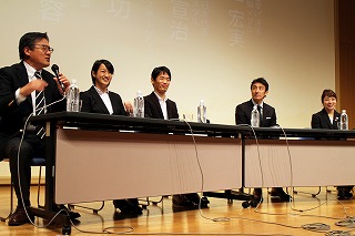 第2部では、北京五輪銅メダリストの朝原宣治氏、世界空手道選手権大会2連覇中の清水希容選手(本学OG)、セレッソ大阪スポーツクラブ理事の宮本功氏の3人を加えて、パネルディスカッションを実施。「世界に挑むトップアスリート~育てる力 育つ力~」をテーマに、トップで戦うために必要な準備や指導方法について意見が交わされました。