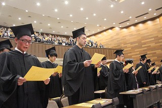 学位(博士)記被授与者代表挨拶では、井上晴可さん(大学院総合情報学研究科)が、指導教員をはじめとするすべての方への感謝の気持ちを述べ、「今後は研究をより深く追求するとともに、将来は関西大学の名に恥じぬよう国際的な研究者・教育者として活躍していきたいと思います」と、今後の活躍を誓いました。