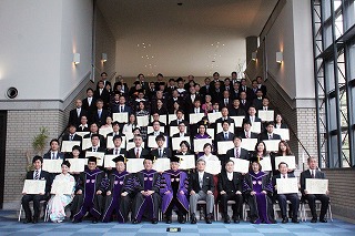 式典では、芝井敬司学長が学位取得者計588人に対して学位記を授与。学位(博士)記授与式で芝井学長は、式辞として学位を取得するまでの長年の努力に対する尊敬の言葉を述べ、"私淑"(心の中でひそかに尊敬すること)という言葉を紹介しながら、「百年前、千年前の人々の言葉に影響を受けることがある。皆さんには"私淑"できる人物と、ぜひ出会ってほしいと思います。これからも学問を続け、夢をかなえてください」と、エールを送りました。