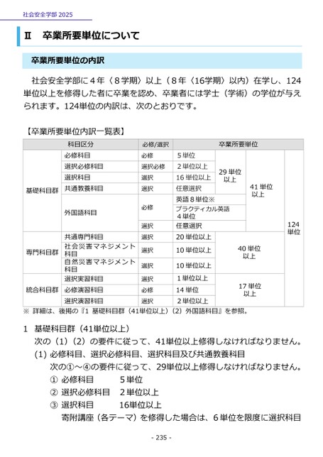 社会安全学部2025Ⅱ卒業所要単位について卒業所要単位の内訳社会安全学部に4年〈8学期〉以上(8年〈16学期〉以内)在学し、124単位以上を修得した者に卒業を認め、卒業者には学士(学術)の学位が与えられます。124単位の内訳は、次のとおりです。卒業所要単位29単位以上5単位2単位以上16単位以上任意選択英語8単位※プラクティカル英語4単位任意選択20単位以上41単位以上124単位10単位以上10単位以上1単位以上14単位2単位以上40単位以上17単位以上必修/選択必修選択必修選択選択必修選択選択選択選択選択必修選択卒業所要単位内訳一覧表】【科目区分必修科目選択必修科目選択科目共通教養科目外国語科目基礎科目群専門科目群統合科目群共通専門科目社会災害マネジメント科目自然災害マネジメント科目選択実習科目必修演習科目選択演習科目※詳細は、後掲の『1基礎科目群(41単位以上)(2)外国語科目』を参照。1基礎科目群(41単位以上)次の(1)(2)の要件に従って、41単位以上修得しなければなりません。(1)必修科目、選択必修科目、選択科目及び共通教養科目次の①~④の要件に従って、29単位以上修得しなければなりません。①必修科目②選択必修科目2単位以上16単位以上③選択科目5単位寄附講座(各テーマ)を修得した場合は、6単位を限度に選択科目-235-