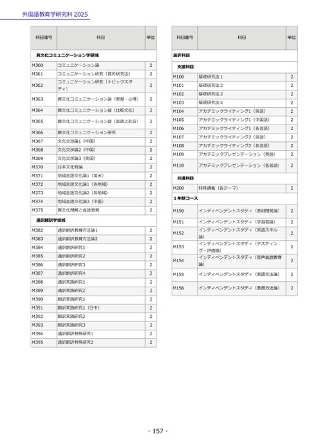 外国語教育学研究科2025科⽬番号科⽬単位科⽬番号科⽬単位選択科⽬ ⽀援科⽬M100M101M102M103M104M105M106M107M108M109M110基礎研究法1基礎研究法2基礎研究法3基礎研究法4アカデミックライティング1(英語)アカデミックライティング1(中国語)アカデミックライティング1(各⾔語)アカデミックライティング2(英語)アカデミックライティング2(各⾔語)アカデミックプレゼンテーション(英語)アカデミックプレゼンテーション(各⾔語) 共通科⽬M200特殊講義(各テーマ)1年制コースM150M151M152M153M154M155M156インディペンデントスタディ(教材開発論)インディペンデントスタディ(学習者論)インディペンデントスタディ(英語スキル論)インディペンデントスタディ(テスティング・評価論)インディペンデントスタディ(⾳声⾔語教育論)インディペンデントスタディ(英語⽂法論)インディペンデントスタディ(教授⽅法論)2222222222222222222222222222222222222222222222222-157- 異⽂化コミュニケーション学領域M360M361M362M363M364M365M366M367M368M369M370M371M372M373M374M375コミュニケーション論コミュニケーション研究(質的研究法)コミュニケーション研究(トピックスタディ)異⽂化コミュニケーション論(教育・⼼理)異⽂化コミュニケーション論(⽐較⽂化)異⽂化コミュニケーション論(⾔語と社会)異⽂化コミュニケーション研究⽂化交渉論1(中国)⽂化交渉論2(中国)⽂化交渉論3(英国)⽇本⽂化特論地域⾔語⽂化論1(英⽶)地域⾔語⽂化論1(各地域)地域⾔語⽂化論2(各地域)地域⾔語⽂化論3(中国)異⽂化理解と⾔語教育 通訳翻訳学領域通訳翻訳教育⽅法論1通訳翻訳教育⽅法論2通訳翻訳研究1通訳翻訳研究2通訳翻訳研究3通訳翻訳研究4通訳実践研究1通訳実践研究2翻訳実践研究1翻訳実践研究1(⽇中)翻訳実践研究2翻訳実践研究3通訳翻訳特殊研究1通訳翻訳特殊研究2M382M383M384M385M386M387M388M389M390M391M392M393M394M395