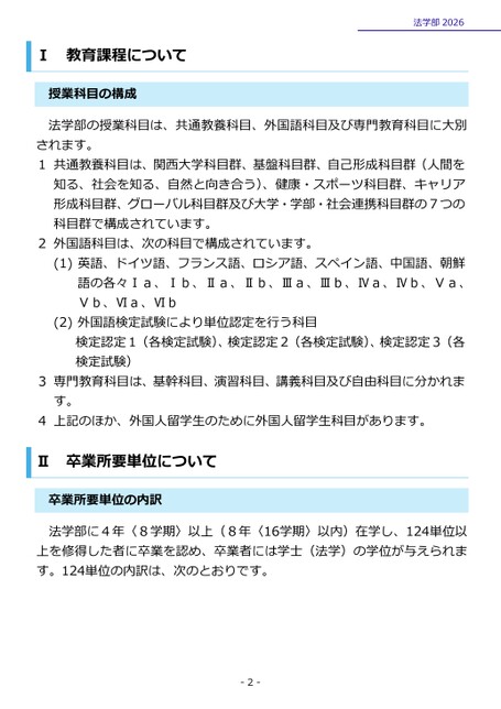 Ⅰ教育課程について授業科目の構成法学部2026法学部の授業科目は、共通教養科目、外国語科目及び専門教育科目に大別されます。1共通教養科目は、関西大学科目群、基盤科目群、自己形成科目群(人間を知る、社会を知る、自然と向き合う)、健康・スポーツ科目群、キャリア形成科目群、グローバル科目群及び大学・学部・社会連携科目群の7つの科目群で構成されています。2外国語科目は、次の科目で構成されています。(1)英語、ドイツ語、フランス語、ロシア語、スペイン語、中国語、朝鮮語の各々Ⅰa、Ⅰb、Ⅱa、Ⅱb、Ⅲa、Ⅲb、Ⅳa、Ⅳb、Ⅴa、Ⅴb、Ⅵa、Ⅵb(2)外国語検定試験により単位認定を行う科目検定認定1(各検定試験)、検定認定2(各検定試験)、検定認定3(各検定試験)3専門教育科目は、基幹科目、演習科目、講義科目及び自由科目に分かれます。4上記のほか、外国人留学生のために外国人留学生科目があります。卒業所要単位についてⅡ卒業所要単位の内訳法学部に4年〈8学期〉以上(8年〈16学期〉以内)在学し、124単位以上を修得した者に卒業を認め、卒業者には学士(法学)の学位が与えられます。124単位の内訳は、次のとおりです。-2-