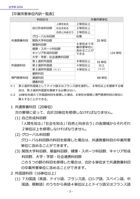 法学部2026【卒業所要単位内訳一覧表】科目区分自己形成科目群人間を知る社会を知る自然と向き合う共通教養科目外国語科目専門教育科目グローバル科目群関西大学科目群基盤科目群健康・スポーツ科目群キャリア形成科目群大学・学部・社会連携科目群第1選択外国語第2選択外国語第3選択外国語(※1)基幹科目演習科目講義科目卒業所要単位2単位以上2単位以上2単位以上任意6単位まで卒業所要単位に含めることができる8単位以上4単位以上4単位以上20単位124単位16単位以上(※2)88単位※1※2第2選択外国語としてドイツ語又はフランス語を選択し、8単位以上を履修する場合は、第3選択外国語を履修する必要はない。16単位を超えて外国語科目を修得した場合、8単位を限度に専門教育科目の単位に算入することができる。1共通教養科目(20単位)次の要領に従って、合計20単位を修得しなければなりません。(1)自己形成科目群「人間を知る」「社会を知る」「自然と向き合う」の各領域からそれぞれ2単位以上を修得しなければなりません。(2)グローバル科目群グローバル科目群の科目を修得した場合は、共通教養科目の卒業所要単位に含めることができます。(3)関西大学科目群、基盤科目群、健康・スポーツ科目群、キャリア形成科目群、大学・学部・社会連携科目群この5つの群の科目を修得した場合は、合計6単位まで共通教養科目の卒業所要単位に含めることができます。2外国語科目(16単位以上)(1)7カ国語(英語、ドイツ語、フランス語、ロシア語、スペイン語、中国語、朝鮮語)のうちから英語4単位以上とドイツ語又はフランス語-3-